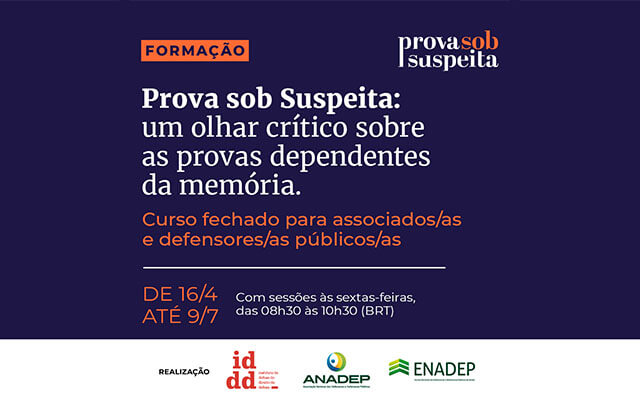 De 16 de abril a 9 de julho, a Associação Nacional das Defensoras e Defensores Públicos (ANADEP), a Escola Nacional das Defensoras e Defensores Públicos (ENADEP) e o Instituto de Defesa do Direito de Defesa (IDDD) promoverão o curso “Prova sob Suspeita: um olhar crítico sobre as provas dependentes da memória". As aulas serão divididas em 13 encontros que acontecerão toda sexta-feira, às 8h30, pela plataforma Zoom.