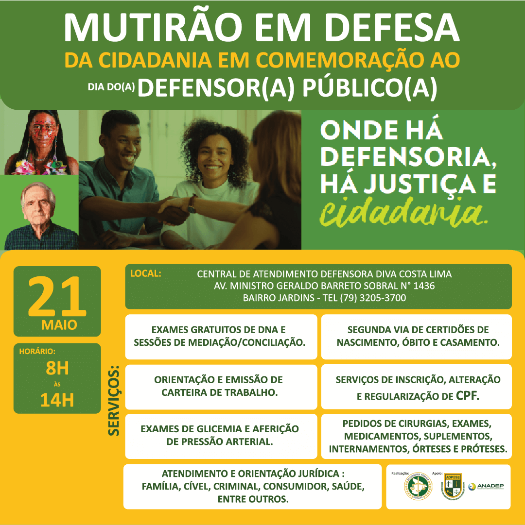 Em comemoração ao Dia Nacional da Defensoria Pública e da Defensora e Defensor Público, que será celebrado em 19 de maio, a Defensoria Pública do Estado de Sergipe estará realizando no sábado (21/5), o Mutirão em Defesa da Cidadania. O evento acontecerá das 8h às 14h, na Central de Atendimento Defensora Diva Costa Lima, localizada na Avenida Geraldo Barreto Sobral, n.1436, Bairro Jardins.